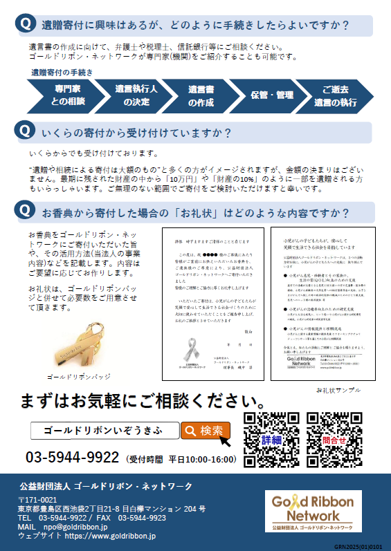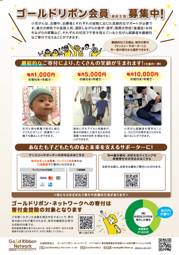 継続的なご寄付(月1回のご寄付、年1回のご寄付)で当法人の活動を支えてくださる『ゴールドリボン会員』を募集しています。
